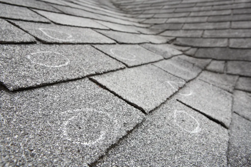- Damage to shingles, including cracks, bruises, and granule loss